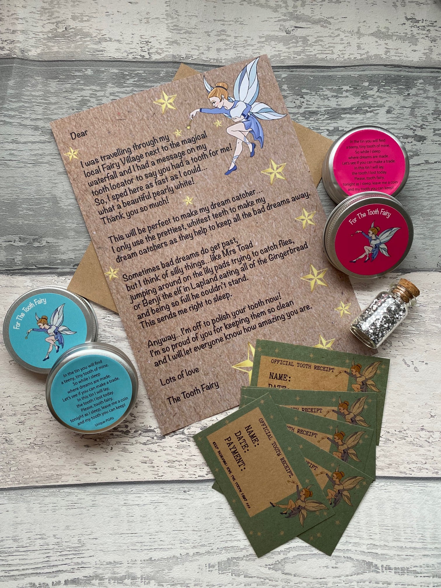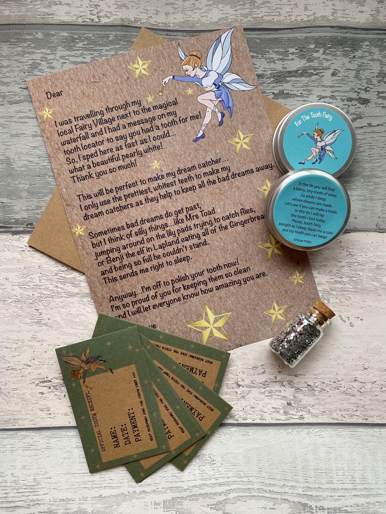 Keep the magic alive with this adorable Personalised Tooth Fairy Kit, perfect for boys and girls. This kit comes with an adorable letter from the tooth fairy and everything you need to celebrate their first tooth.